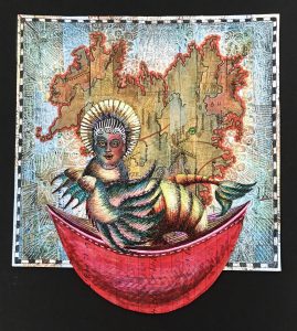 My work speaks to creating new maps of my discoveries, highlighting the self-portrait „monsters“ as the Voyager. The boats that are often times present, symbolize the journey, which is absolutely leaving an imprint on my heart.