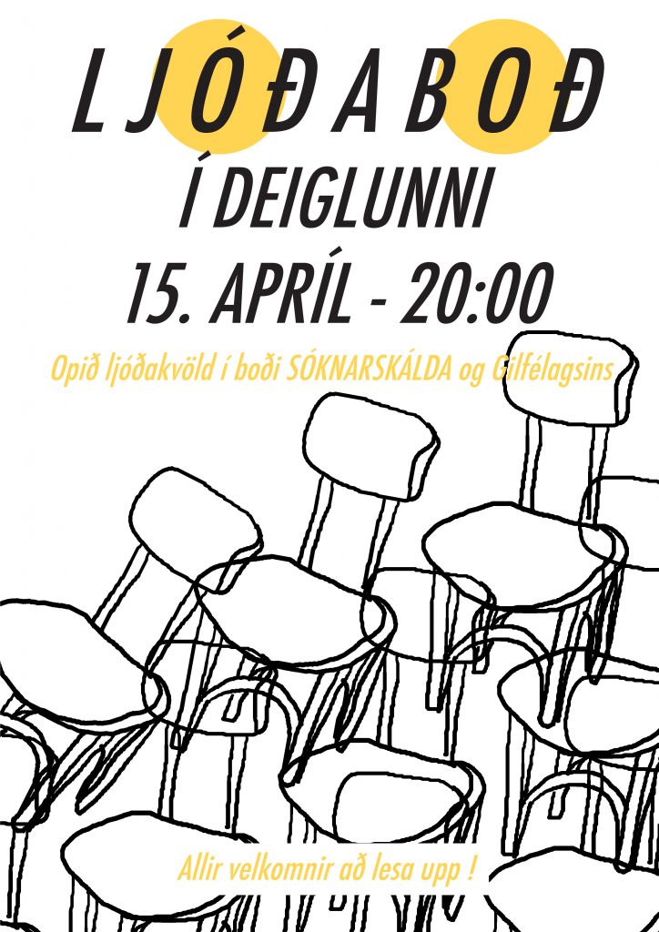 Sóknarskáld í samstarfi við Gilfélagið bjóða í LJÓÐABOÐ í Deiglunni á Akureyri, sunnudagskvöldið 15. apríl klukkan 20:00. Opið ljóðakvöld þar sem allir eru velkomnir að flytja og lesa ljóðin sín. Skúffuskáld, stórskáld, níðvísur og ástarljóð öll velkomin.