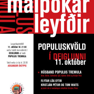 Populus tremula og Gilfélagið bjóða til skemmtikvölds í Deiglunni þann 11. október klukkan 21.00 Hið rómaða Húsband Populus tremula leikur lög eftir Kristján Pétur Sigurðsson og Tom Waits og kynnir væntanlegar sólóplötur Kristjáns Péturs. Húsbandið skipa þeir Arnar...