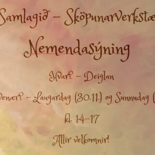 Þriðja nemendasýning Samlagsins sköpunarverkstæðis opnar laugardaginn 30. nóvember kl. 14.00 Syningin verður einnig opin sunnudaginn 1. desember frá 14 -17. Aðeins þessi eina sýningarhelgi! Lokasýning á afrakstri nemenda sem sótt hafa námskeið Samlagsins – sköpunarverkstæðis nú í haust....